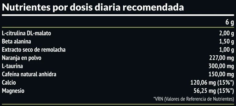 Ingredientes: L-citrulina DL-malato, beta alanina, extracto seco de remolacha (Beta vulgaris, raíz), sales cálcicas de ácido ortofosfórico, naranja en polvo (Citrus sinensis L., fruto), L-taurina, carbonato de magnesio, antiaglomerante (dióxido de silicio), cafeína natural anhidra (Coffea arabica, fruto), aroma y estevia (glucósidos de esteviol). Sin gluten.