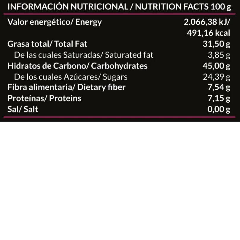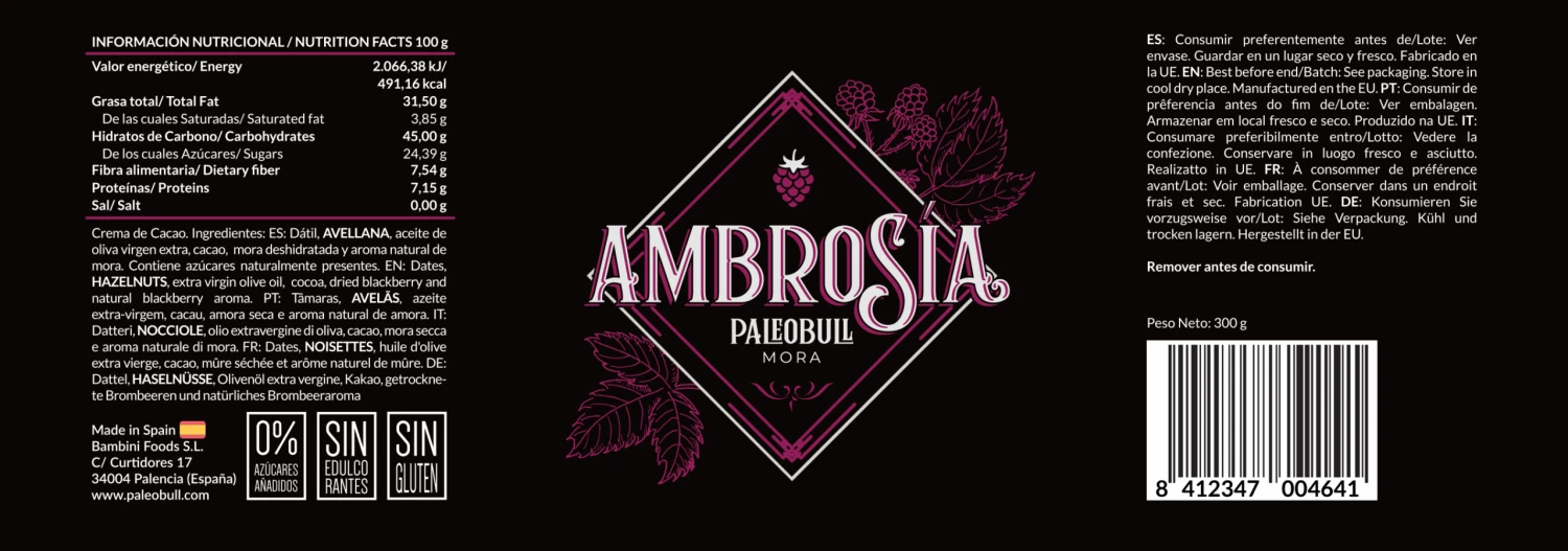 Ingredientes: Dátil, avellana, aceite de oliva virgen extra, cacao en polvo natural, mora deshidratada y aroma natural de mora. Peso: 300 g.