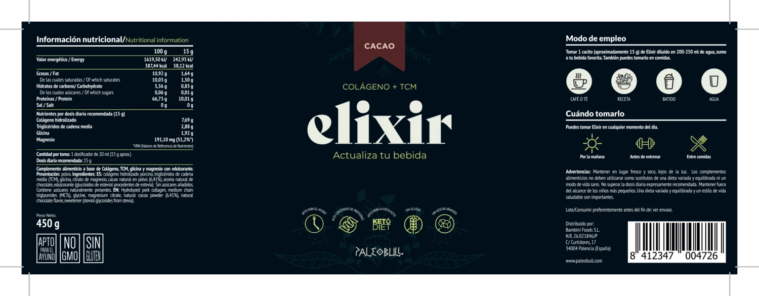 Elixir es un complemento alimenticio elaborado con colágeno en polvo, triglicéridos de cadena media (TCM o MCT por sus siglas en inglés) y glicina. Las versiones de Cacao y Vainilla tienen además magnesio y están edulcoradas con estevia.