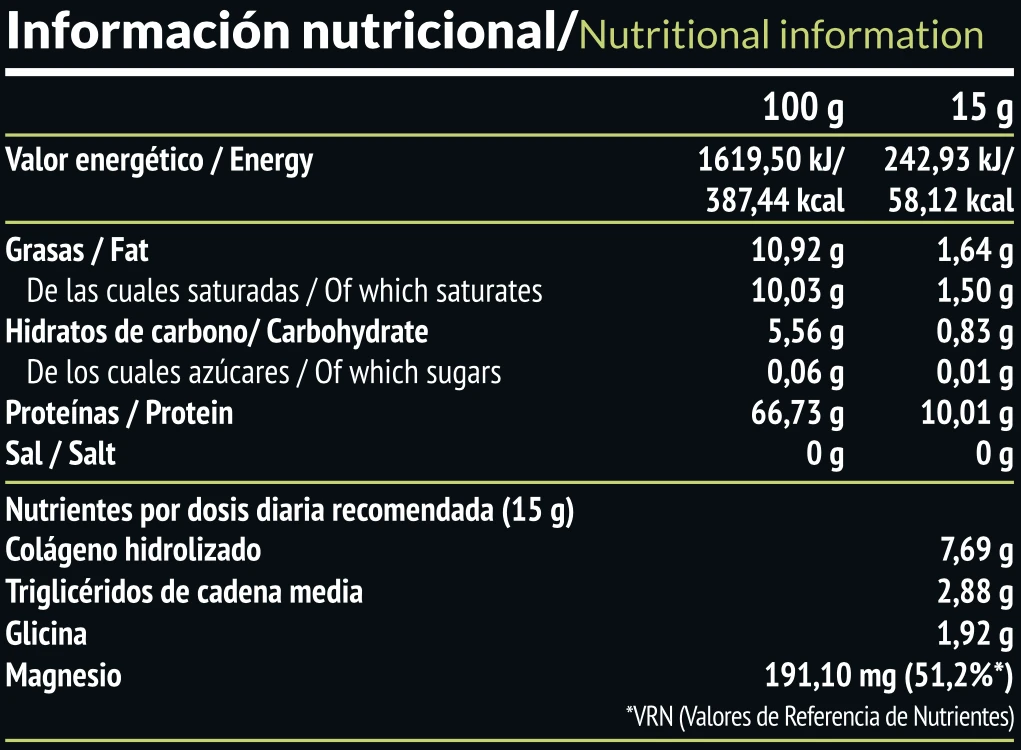 Colágeno y aceite TCM (triglicéridos de cadena media). Solo ingredientes naturales: Colágeno hidrolizado en polvo, TCM, glicina, citrato de magnesio, cacao natural en polvo, aroma y estevia (glucósido de esteviol 0,06%). Sin gluten. Peso neto: 450 g (30 dosis).