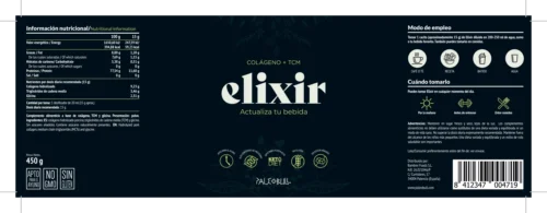 Elixir es un complemento alimenticio elaborado con colágeno en polvo, triglicéridos de cadena media (TCM o MCT por sus siglas en inglés) y glicina. Las versiones de Cacao y Vainilla tienen además magnesio y están edulcoradas con estevia.