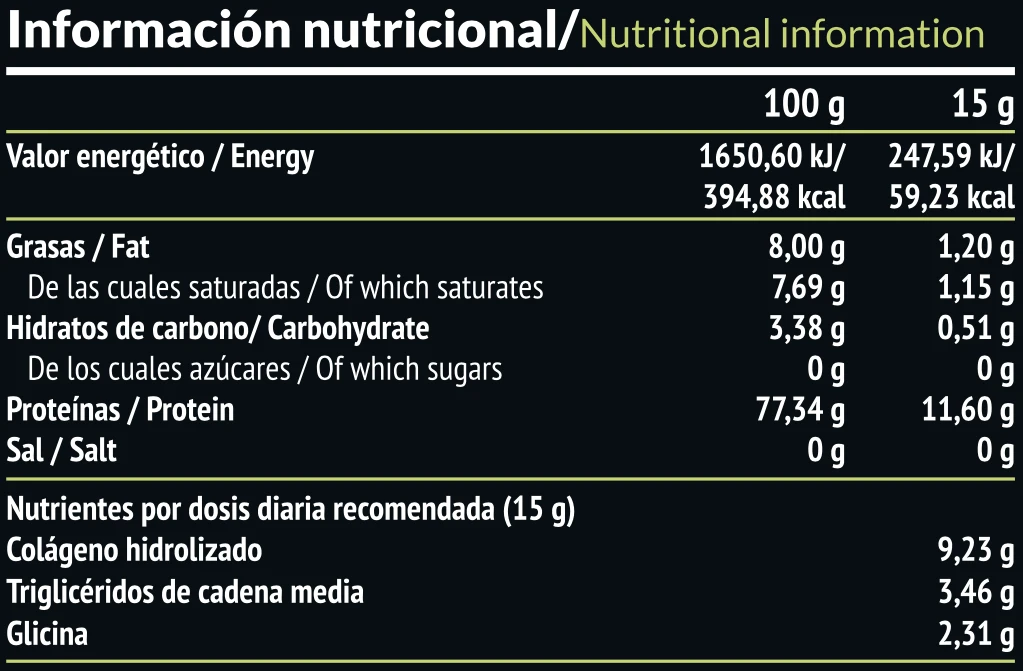 Colágeno y aceite TCM (triglicéridos de cadena media). Solo ingredientes naturales: Colágeno hidrolizado en polvo, TCM y glicina. Sin gluten. Peso neto: 450 g (30 dosis).