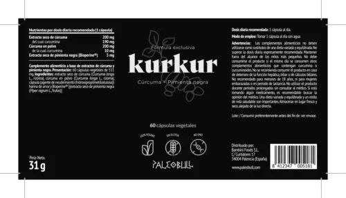 Ingredientes: extracto seco de cúrcuma (Curcuma longa L., rizoma), cúrcuma en polvo (Curcuma longa L., rizoma), cápsula vegetal, harina de arroz y Bioperine® [(extracto seco de pimienta negra (Piper nigrum L., frutos)].