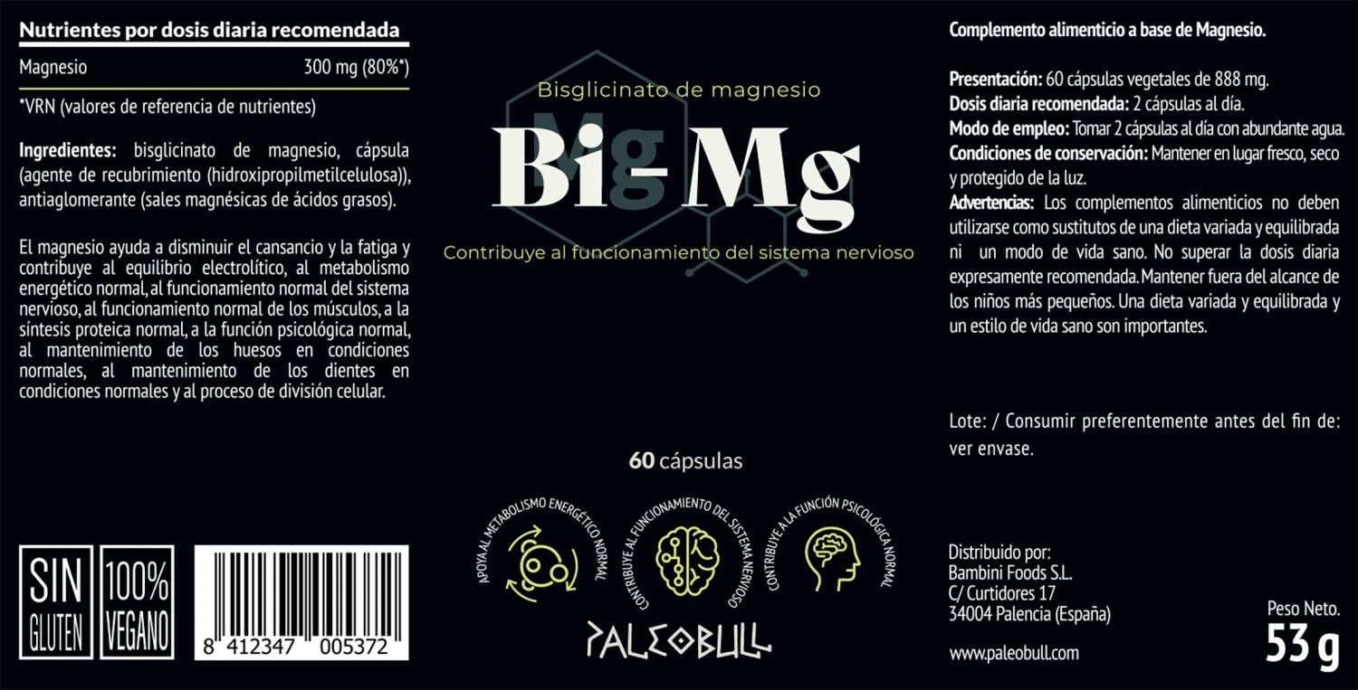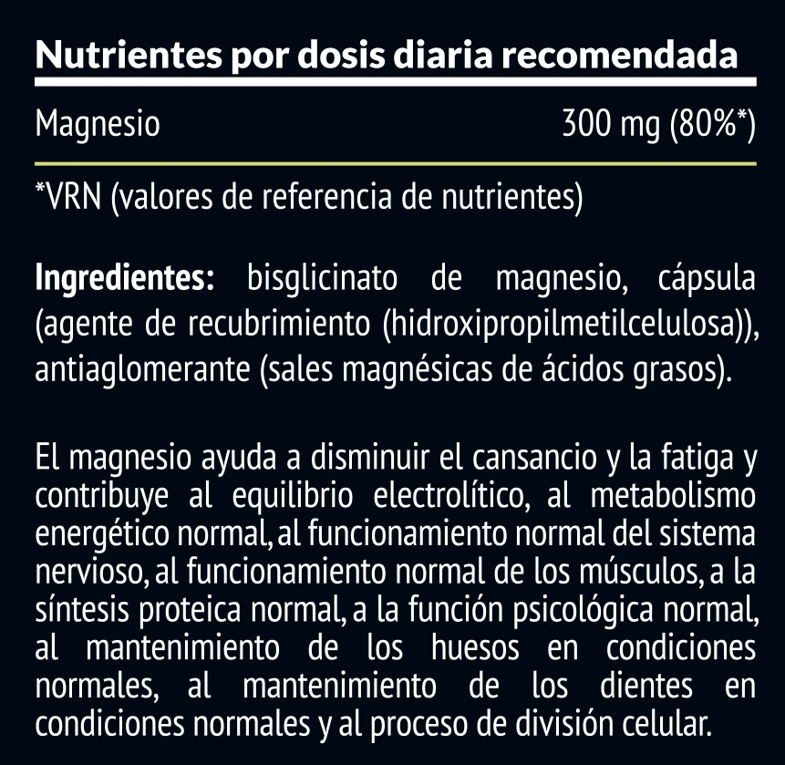 Ingredientes: bisglicinato de magnesio, cápsula vegetal, antiaglomerante (sales magnésicas de ácidos grasos).