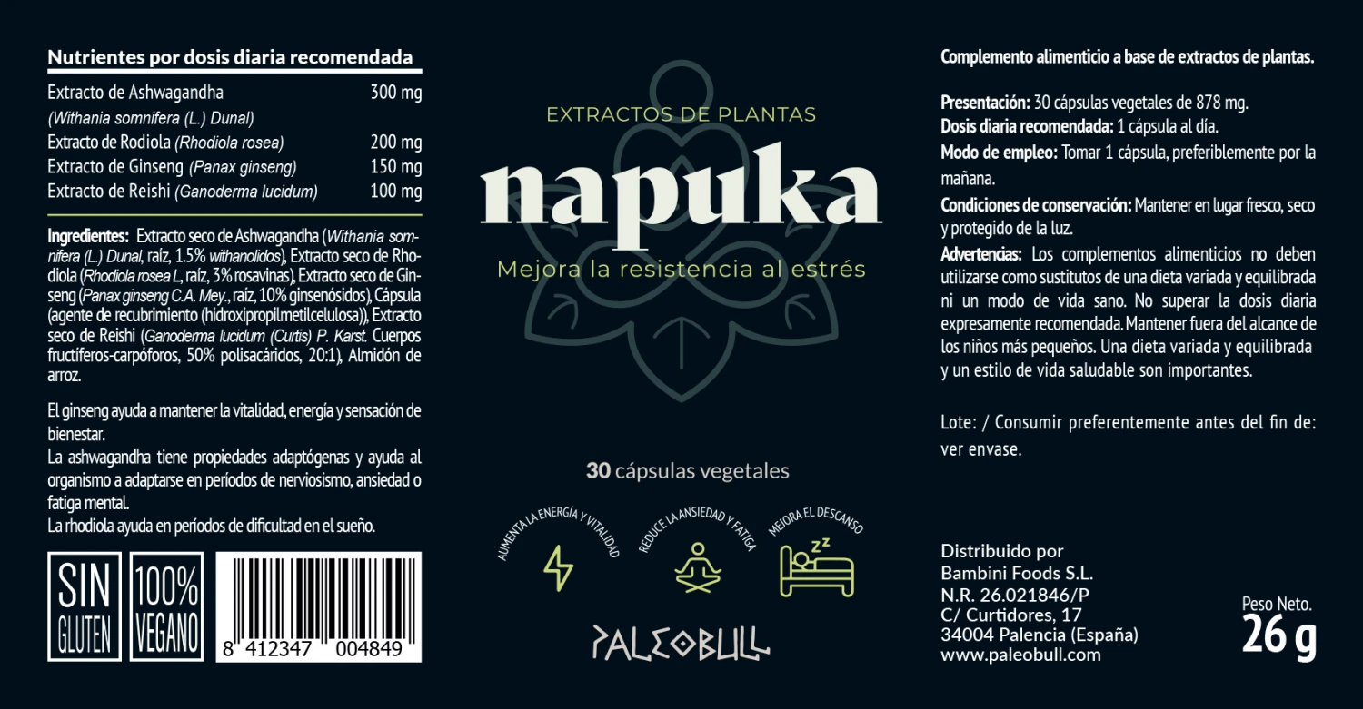 Napuka es una cuidada selección de extractos de plantas adaptógenas. Las plantas adaptógenas se caracterizan por contribuir a nuestra capacidad para resistir el estrés y, en situaciones de fatiga o agotamiento, ya sea físico o mental, incrementar el nivel de energía y vitalidad.