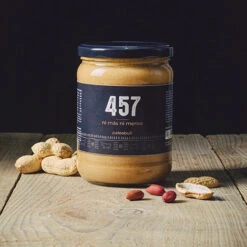 Solo cacahuetes. Nuestra crema de cacahuete natural es el resultado de tostar y triturar «457» cacahuetes en cada tarro, ni mås ni menos. Peso neto: 500 g.