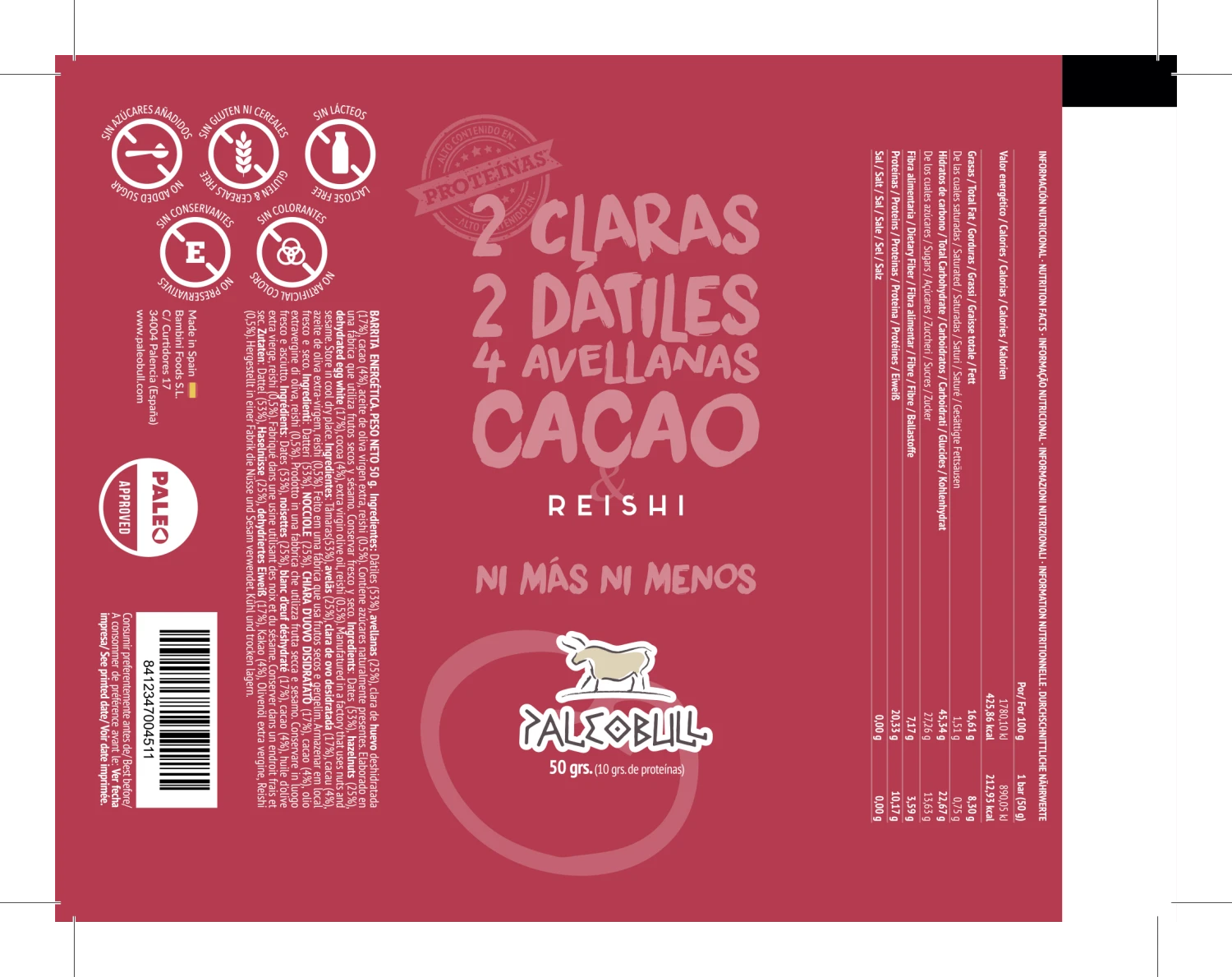 Disfruta de estas 15 deliciosas barritas energéticas de cacao y reishi con alto contenido en proteínas. Elaboradas únicamente con ingredientes naturales: dátiles, avellanas, clara de huevo deshidratada, cacao, aceite de oliva virgen extra y reishi. Ideales para un estilo de vida saludable.
