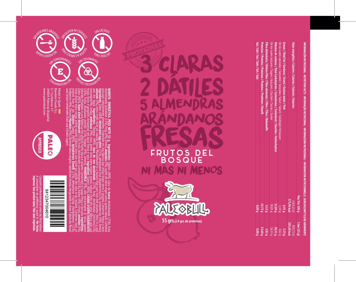 Disfruta de estas 15 deliciosas barritas energĂ©ticas de frutos del bosque con alto contenido en proteĂnas. Elaboradas Ășnicamente con ingredientes naturales: dĂĄtiles, clara de huevo deshidratada, arĂĄndano deshidratado, fresa deshidratada, limĂłn deshidratado, almendra, aceite de oliva virgen extra y aroma natural.