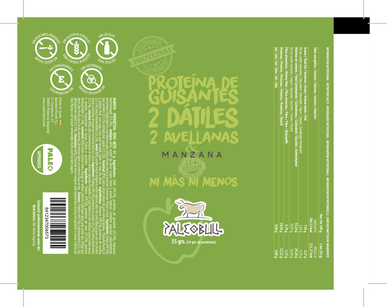 Disfruta de estas 15 deliciosas barritas energéticas de manzana y proteína de guisantes con alto contenido en proteínas. Elaboradas únicamente con ingredientes naturales: dátiles, proteína de guisante, manzana deshidratada, avellanas, aroma natural de manzana. Ideales para un estilo de vida saludable.