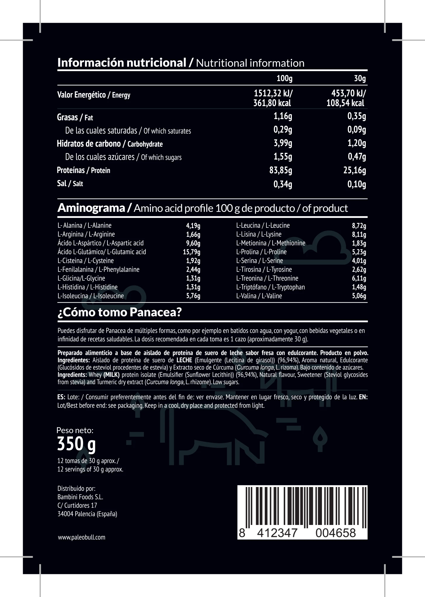 Aislado de proteína de suero de leche de vacas criadas en libertad, que han sido alimentadas con pasto (grass fed), sabor fresa. Solo ingredientes naturales: Aislado de proteína de suero de leche (emulgente: lecitina de girasol) (96,94%), aroma natural de fresa, estevia y cúrcuma. Alérgenos: Leche. Sin gluten.