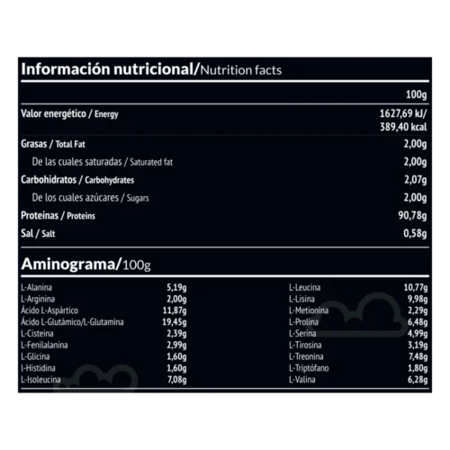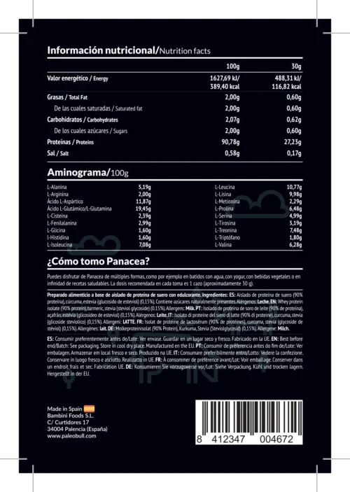 Aislado de proteína de suero de leche de vacas criadas en libertad, que han sido alimentadas con pasto (grass fed), sabor neutro. Solo ingredientes naturales: Aislado de proteína de suero (emulgente: lecitina de girasol) (99,75% proteína), cúrcuma, estevia (0,15%). Alérgenos: Leche. Sin gluten.