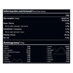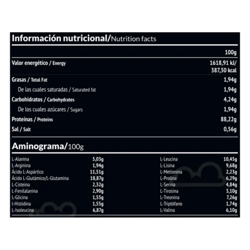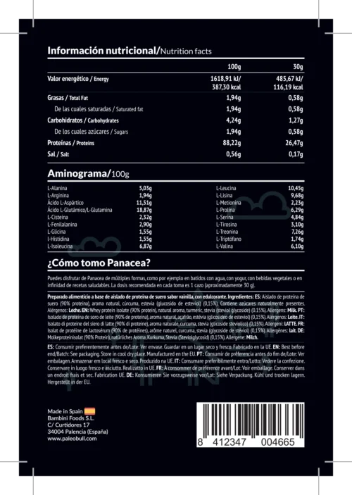 Aislado de proteína de suero de leche de vacas criadas en libertad, que han sido alimentadas con pasto (grass fed), sabor vainilla. Solo ingredientes naturales: Aislado de proteína de suero (emulgente: lecitina de girasol) (96,95% proteína), aroma natural de vainilla, cúrcuma, estevia (0,15%). Alérgenos: Leche. Sin gluten.