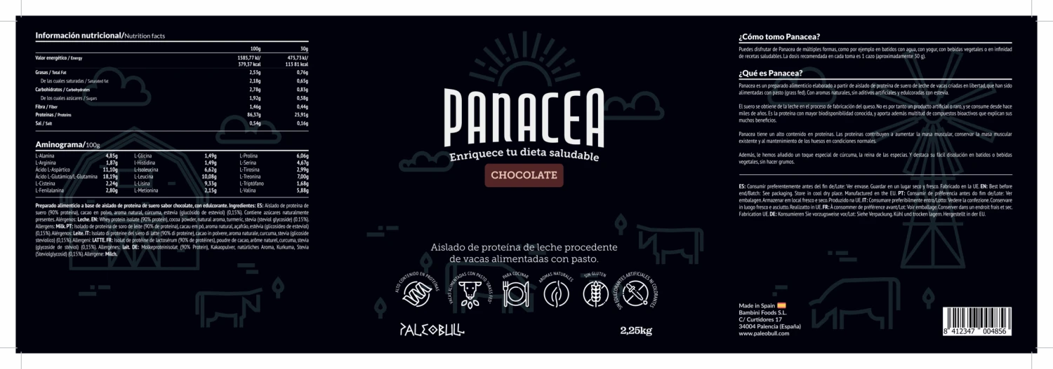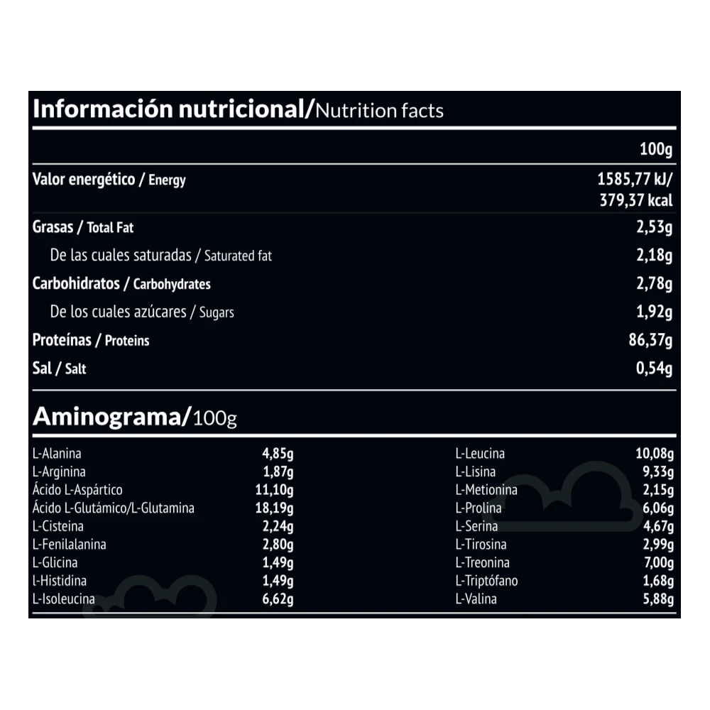 Solo ingredientes naturales: Aislado de proteína de suero (emulgente: lecitina de girasol) (93,3% proteína), cacao en polvo, aroma natural, cúrcuma, estevia (0,15%).