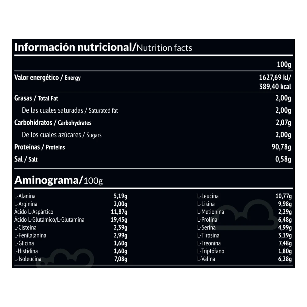 Solo ingredientes naturales: Aislado de proteína de suero (emulgente: lecitina de girasol) (99,75% proteína), cúrcuma, estevia (0,15%).