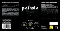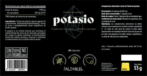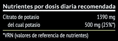Ingredientes: citrato de potasio, cápsula vegetal, harina de arroz y antiaglomerante (sales magnésicas de ácidos grasos).