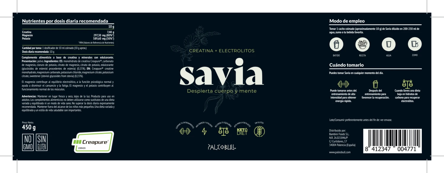 Savia está elaborada con creatina monohidrato de Creapure® y una combinación de sales minerales para facilitar la absorción de los electrolitos. La patente de creatina Creapure® destaca en el mercado por su calidad y pureza.