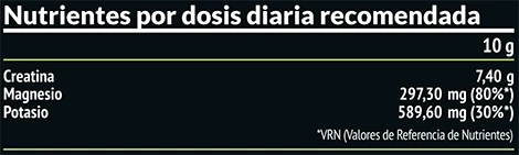 Creatina y electrolitos esenciales (magnesio y potasio). Ingredientes: Creatina Creapure®, carbonato de magnesio, cloruro de potasio, citrato de magnesio, citrato de potasio y estevia (glucósido de esteviol) (0,15%). Sin gluten.