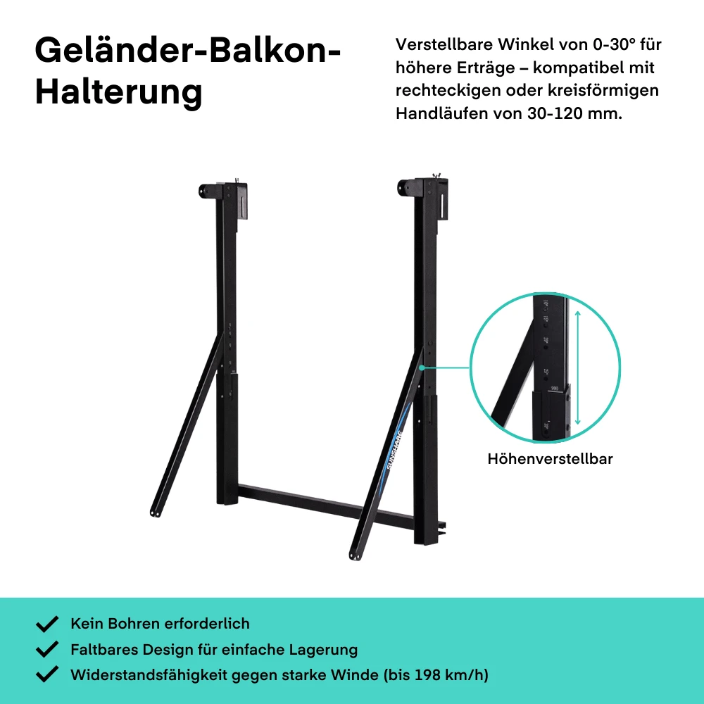 Sunshare Balkonkraftwerk 400W für Gitterbalkone – kompakte 200W-Module mit vormontierter Halterung, flexibel einstellbar (0–30°), einfache Montage ohne Bohren, inkl. 800W-Mikro-Wechselrichter.
