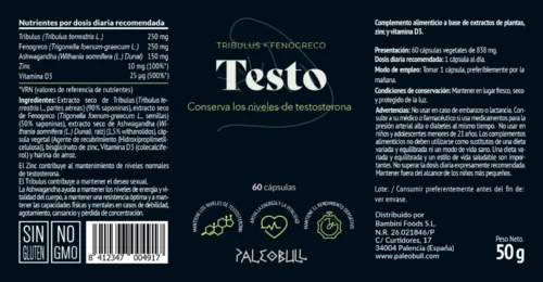 Ingredientes: extracto seco de Tribulus (Tribulus terrestris, partes aéreas) (90% saponinas), extracto seco de Fenogreco (Trigonella foenum-graecum, semillas) (50% saponinas), extracto seco de Withania (Whitania somnifera, raíz) (1,5% withanolidos), cápsula vegetal, bisglicinato de zinc, Vitamina D3 (colecalciferol) y harina de arroz.