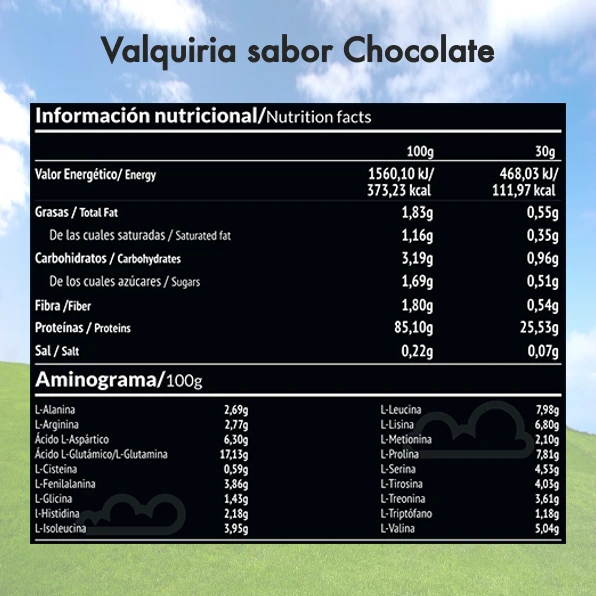 Sabor Chocolate: Aislado de proteína de leche (90% proteína), cacao en polvo, aroma natural, cúrcuma, estevia (0,15%).