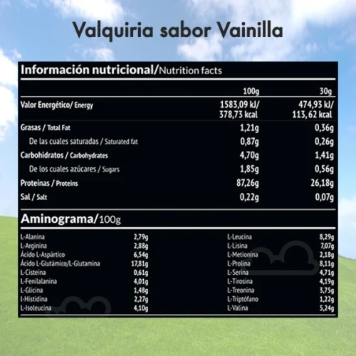 Sabor Vainilla: Aislado de proteína de leche (90% proteína), aroma natural de vainilla, cúrcuma, estevia (0,15%).