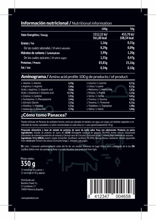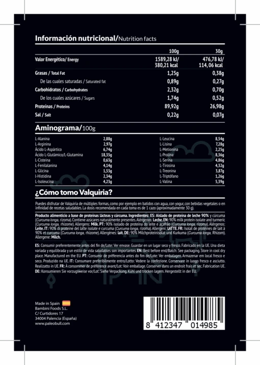 Aislado de proteína de leche de vacas gallegas criadas en granjas extensivas, sabor neutro. Solo ingredientes naturales: Aislado de proteína de leche (90% proteína) y cúrcuma. Alérgenos: Leche. Sin gluten.