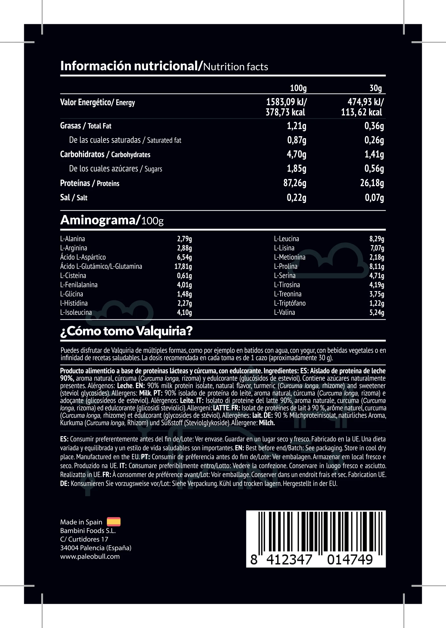 Aislado de proteína de leche de vacas gallegas criadas en granjas extensivas, sabor vainilla. Solo ingredientes naturales: Aislado de proteína de leche (90% proteína), aroma natural de vainilla, cúrcuma, estevia (0,15%). Alérgenos: Leche. Sin gluten.
