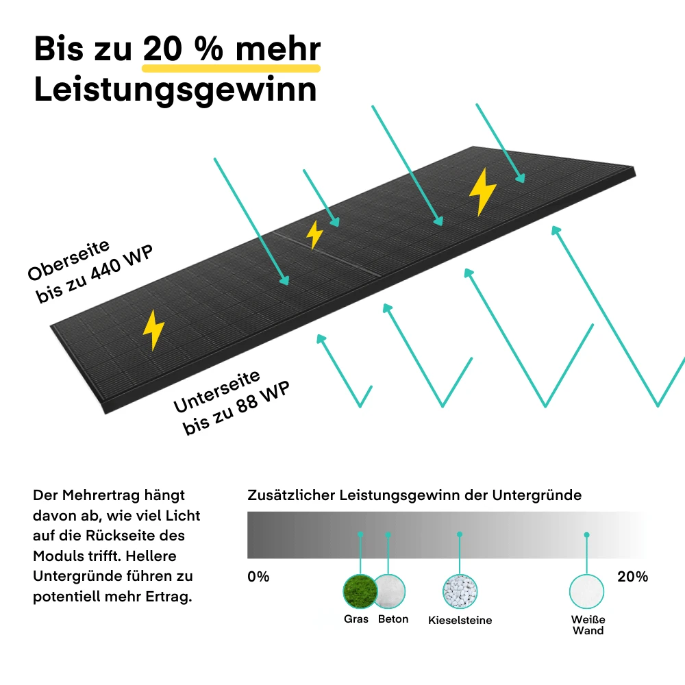 Balkonkraftwerk mit 900-Watt-Leistung dank bifazialer Eigenschaft â Komplettpaket fĂŒr Gitterbalkone mit 800W-Wechselrichter mit integriertem WiFi-Modul.