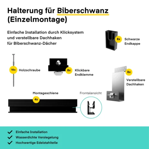 Balkonkraftwerk mit bis zu 1000-Watt-Leistung dank bifazialer Eigenschaft – Komplettpaket für Biberschwanzdächer mit 800W-Wechselrichter mit integriertem WiFi-Modul.