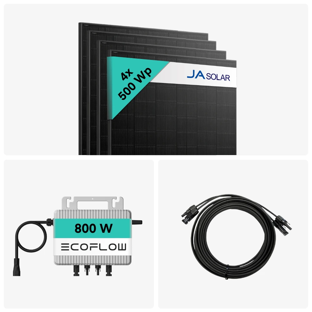 Yuma Balkonkraftwerk mit vier bifazialen Solarmodulen (2000 W) in Full-Black-Optik und EcoFlow STREAM-Wechselrichter (800 Watt).