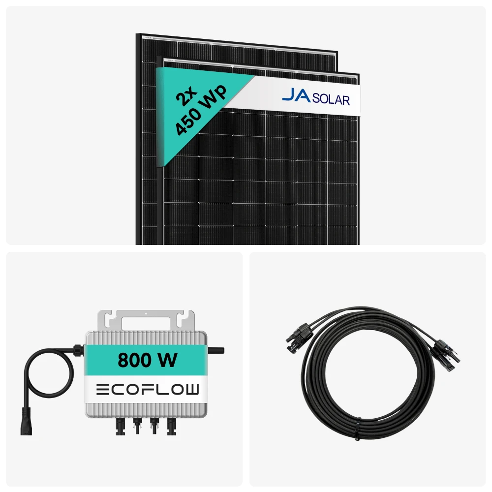 Yuma Balkonkraftwerk mit zwei bifazialen Solarmodulen (900 W) in Black-Frame-Optik und EcoFlow STREAM-Wechselrichter (800 Watt).